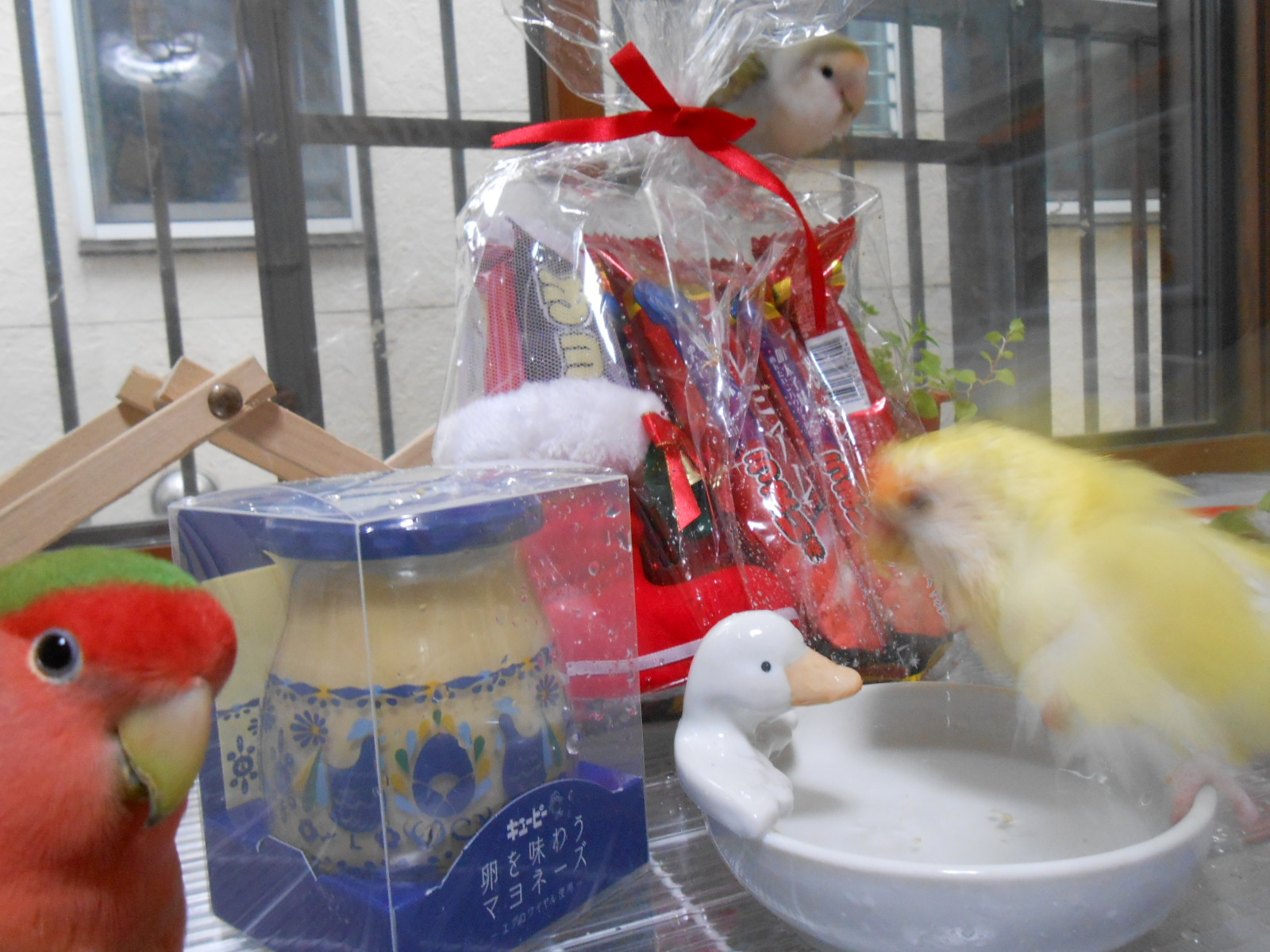 それと、かわゆいアヒルさんのお皿(お玉置きなんだって~)はなつえさんの愛鳥さんがお風呂に使ってるそうなのでマネっこしてお水入れてみましたら、検品係さんが