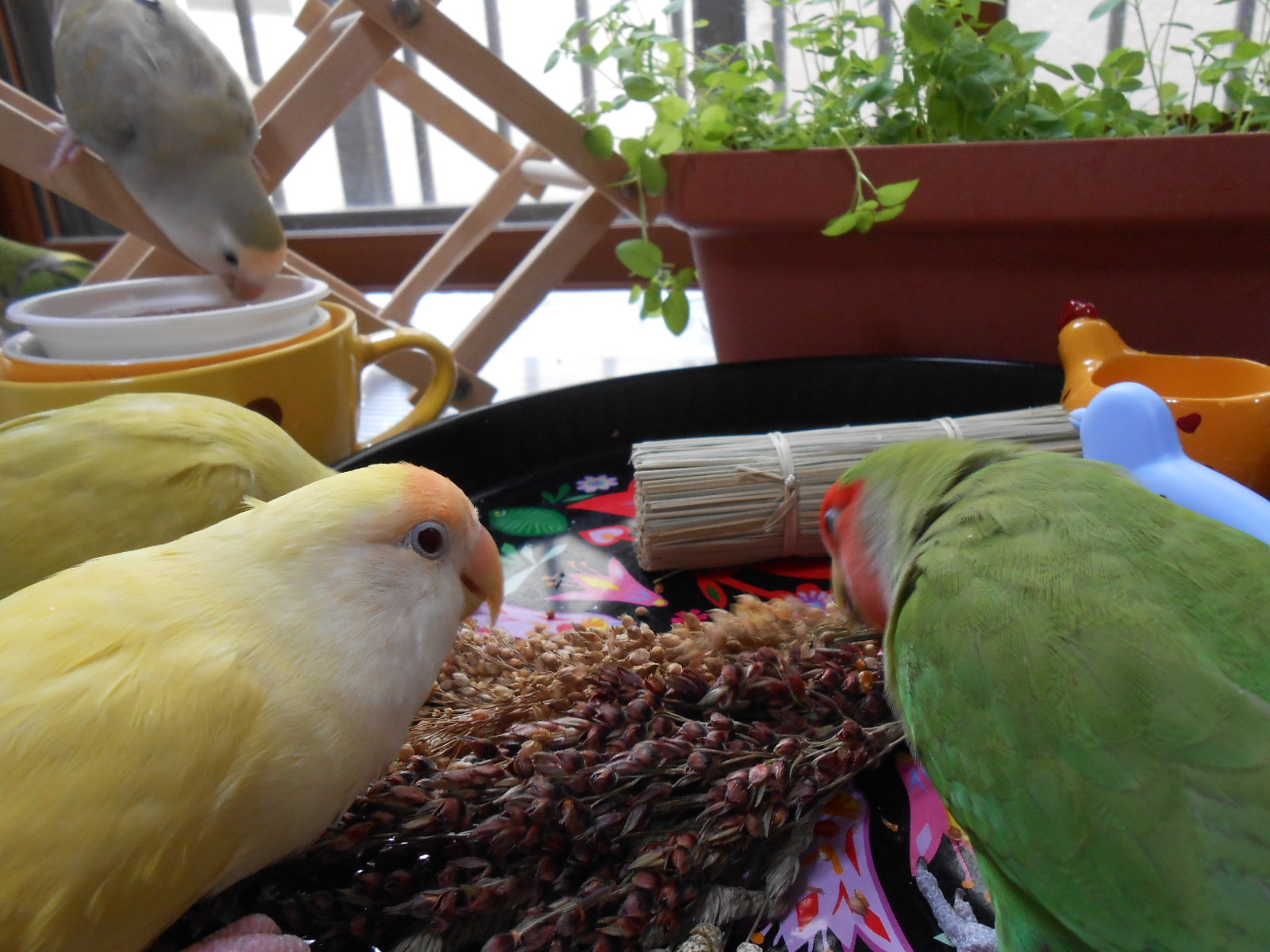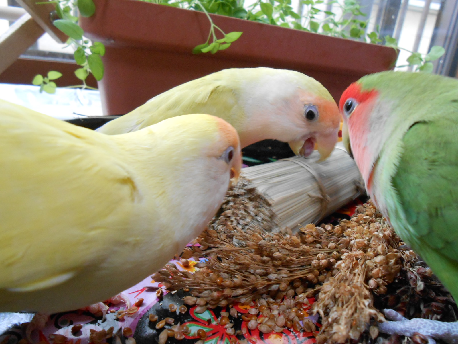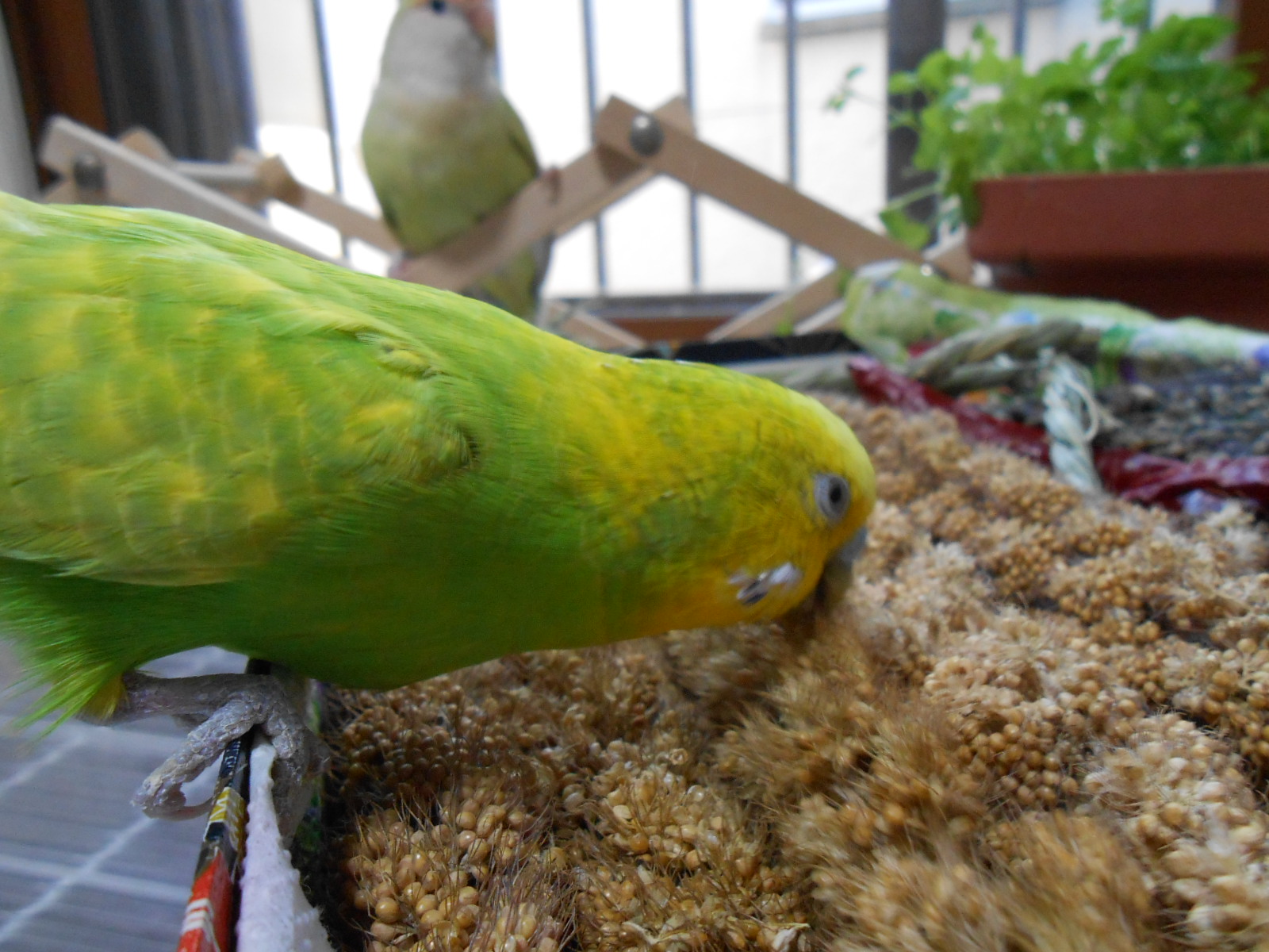 うちのぴーちゃんは、放鳥してどんなにお腹がすいていても、ケージには絶対入ってくれない子なんです。なるべく捕まえたくないので、粟穂や茶きび穂で釣ってます。粟穂はおやつというより生活必需品なので、我が家では在庫切らさないことが必須なんですねー。少しばかりのおすそ分けで、みんながよいお顔をしてくれたら私も嬉しいです。