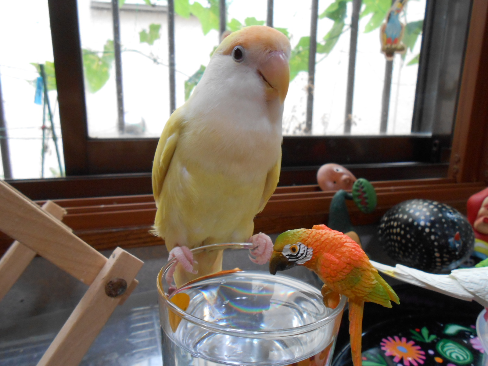 ガチャのインコさんとは言えどもアレですよ、それぞれ行った先のお宅によっていろんな雰囲気出てくるんじゃないかと思うんですが、うちではさっそくお風呂に集合しまして