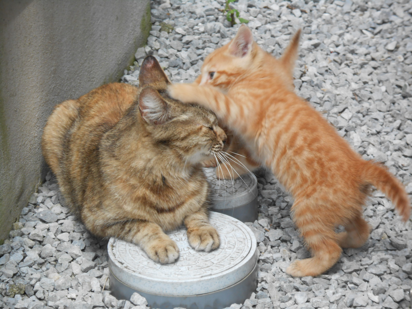 エアコンの室外機のあたりに親子ぬこが住んで育児してるらしき事は気づいてたんですが、大きくなればどっか行っちゃうからほっときなさいよ、噛まれるわけでもないし・・・って事でほっといたら仔ぬこがずいぶん成長したようでひょこひょこ出歩くようになりましたねの図