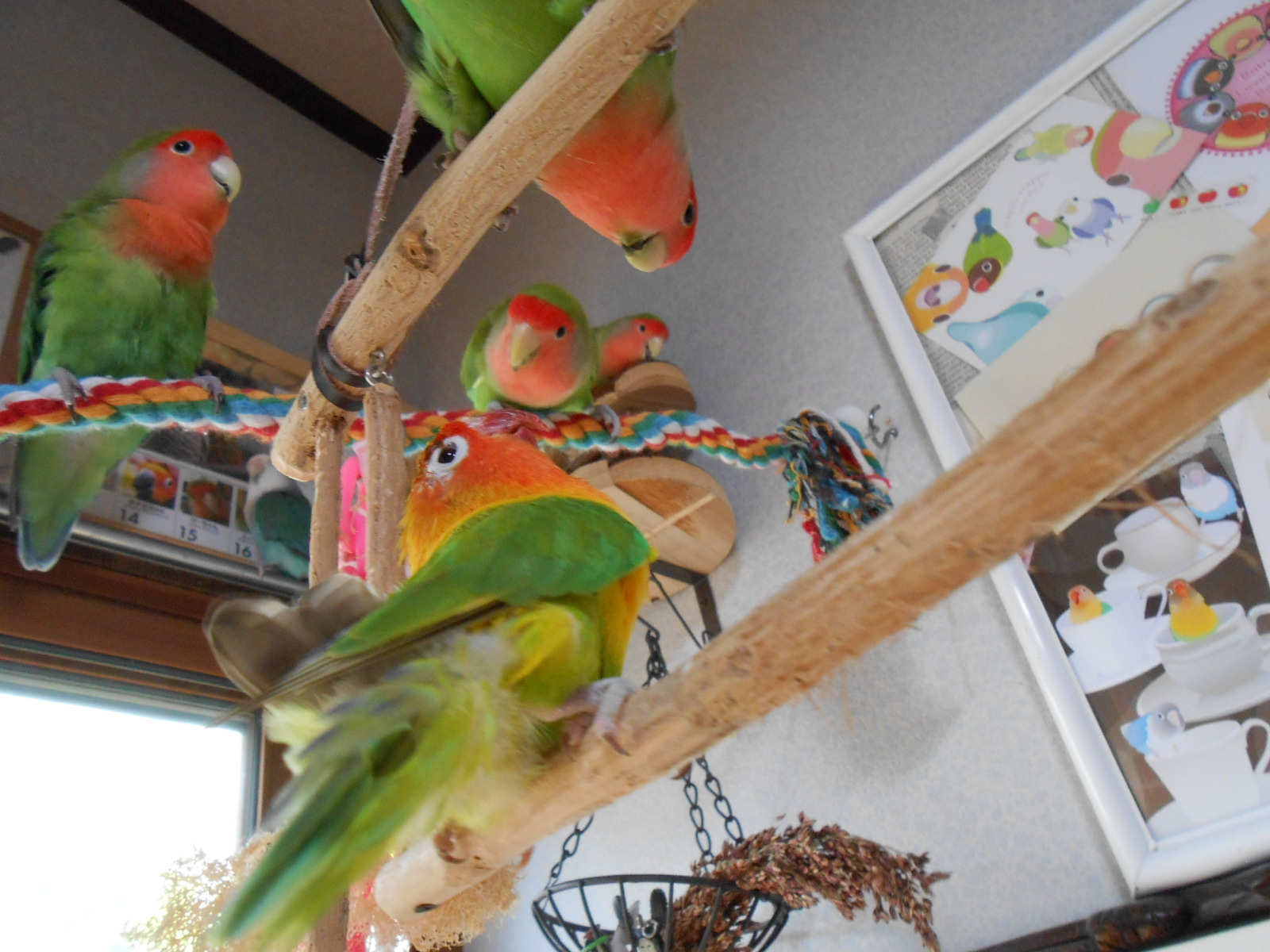 こうやって好きに飛んで好きなところで遊んで餌探して・・・は野生風味の醍醐味なんですが、ボタンインコのみかんさんは飛べない子なのでいつも下のパーチに止まってるだけになってしまいまして~~。