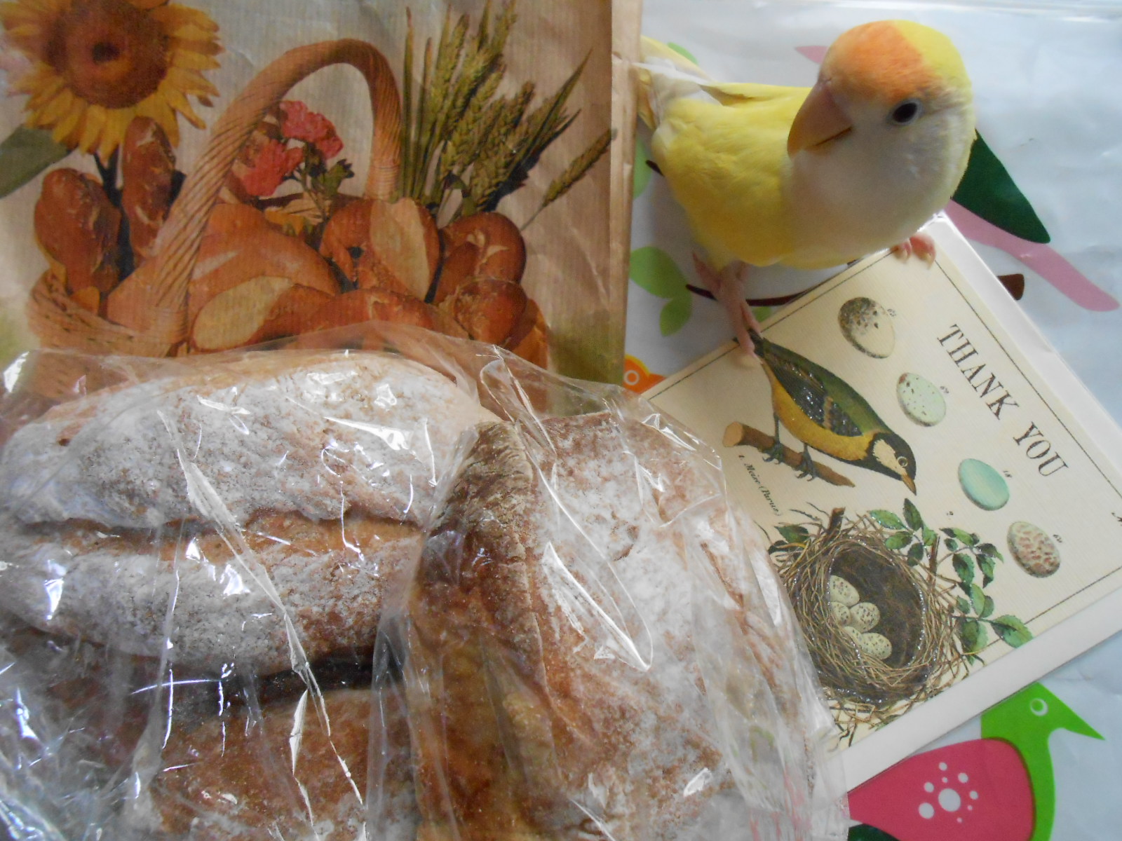 オサレなパンの袋にオサレなパンが入って、オサレな鳥ポストカードまで入ってるオサレな演出
