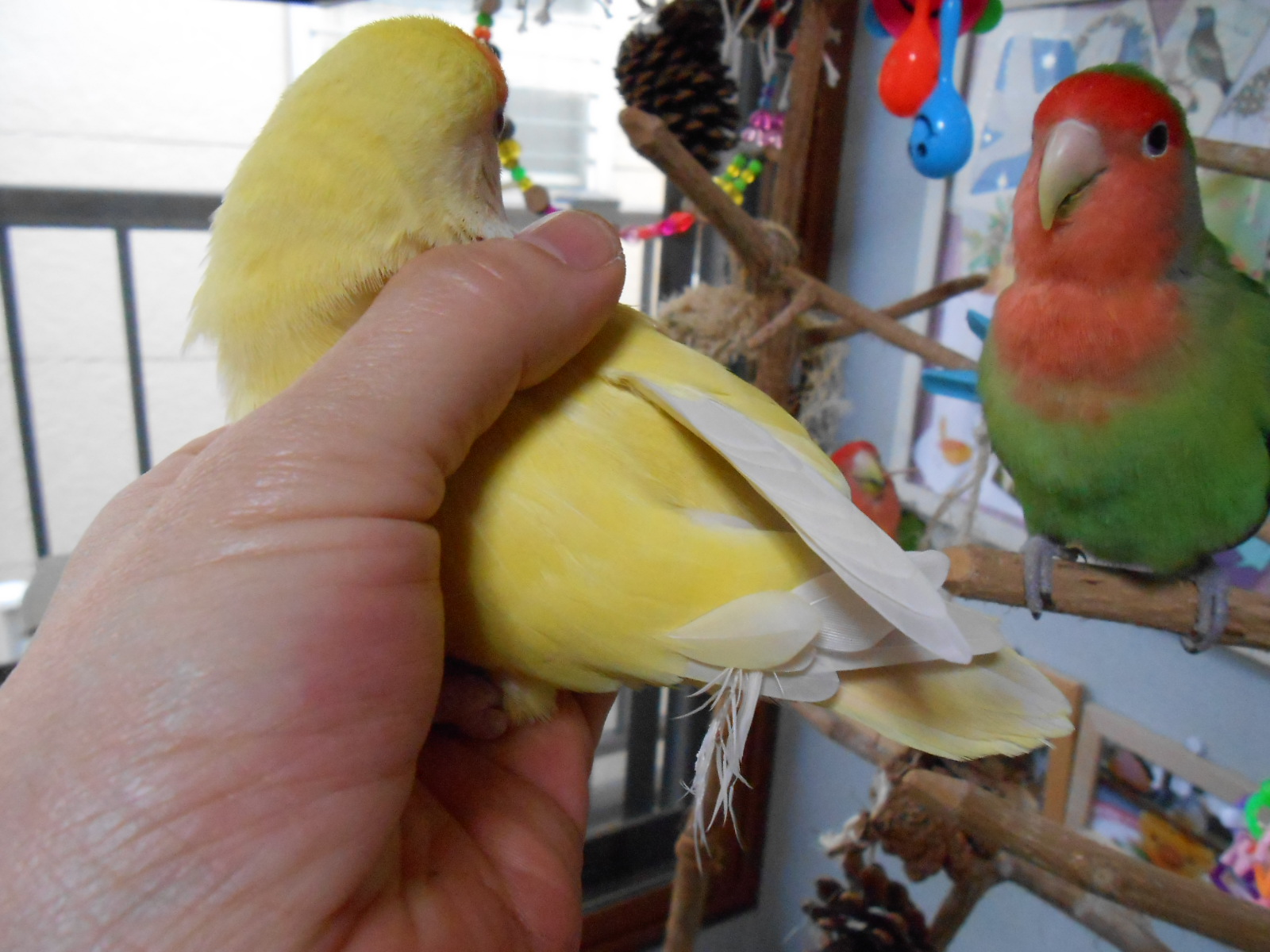 グロいので写真は鳥ませんでしたけども、今朝のはアレでした、これは抜いちゃったほうがいいか?なカンジの出血中の羽軸でしてー。