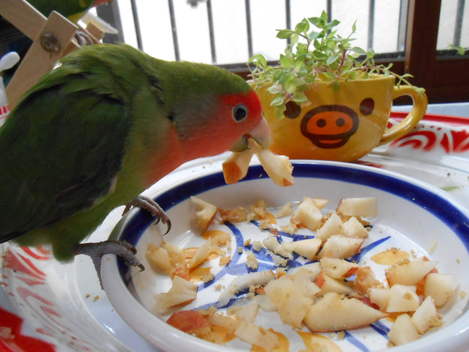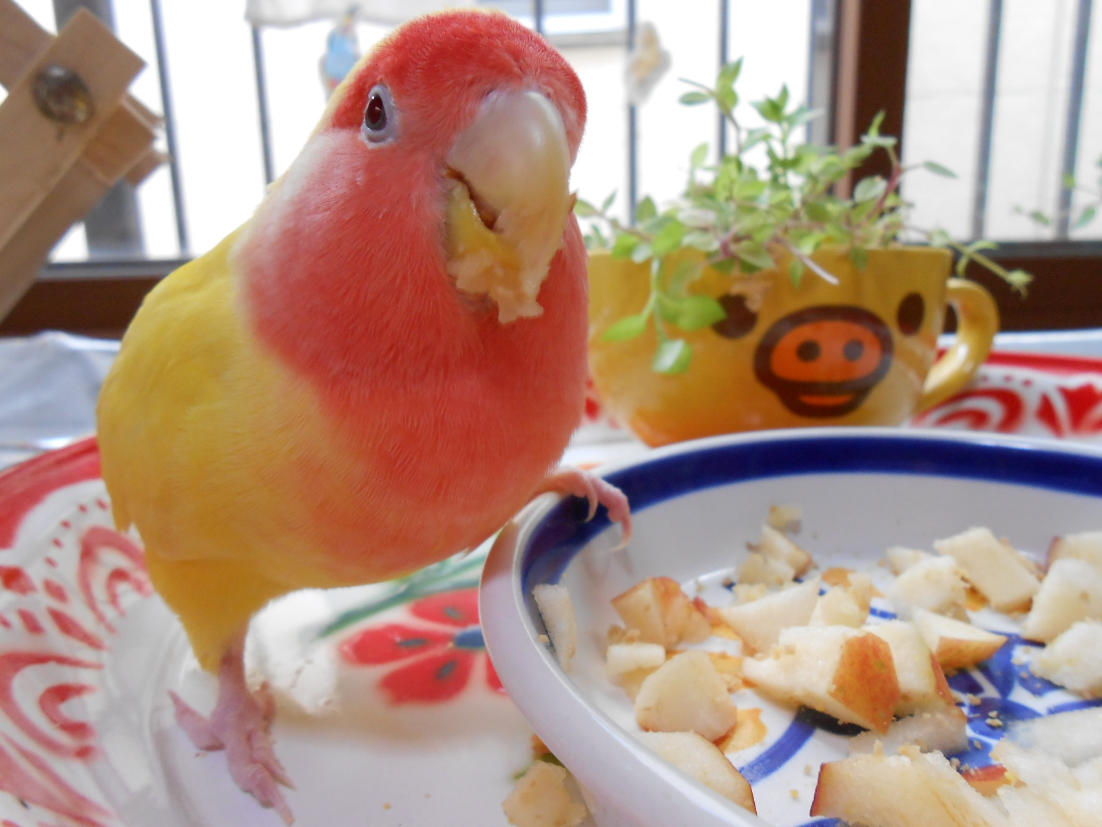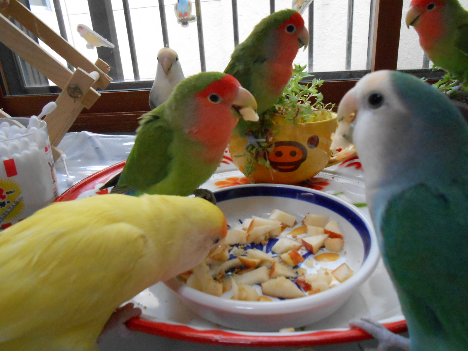 そんな平和圏のみなさんはボチボチまた換羽が来てるようなので、やはりたんぱく質をやや多めのおやつ・・・と言いたい所ですが台所に旬過ぎ切ったおリンゴが残ってましたので