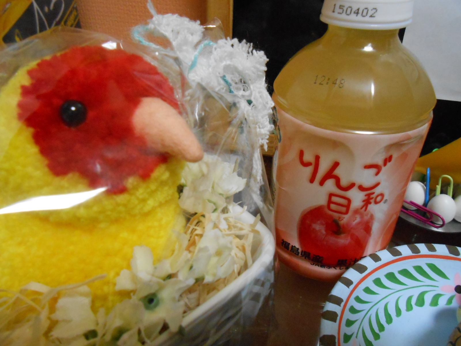 机の上のkaoryさんお手製のまるこさんとおリンゴジュースに力をもらいつつ