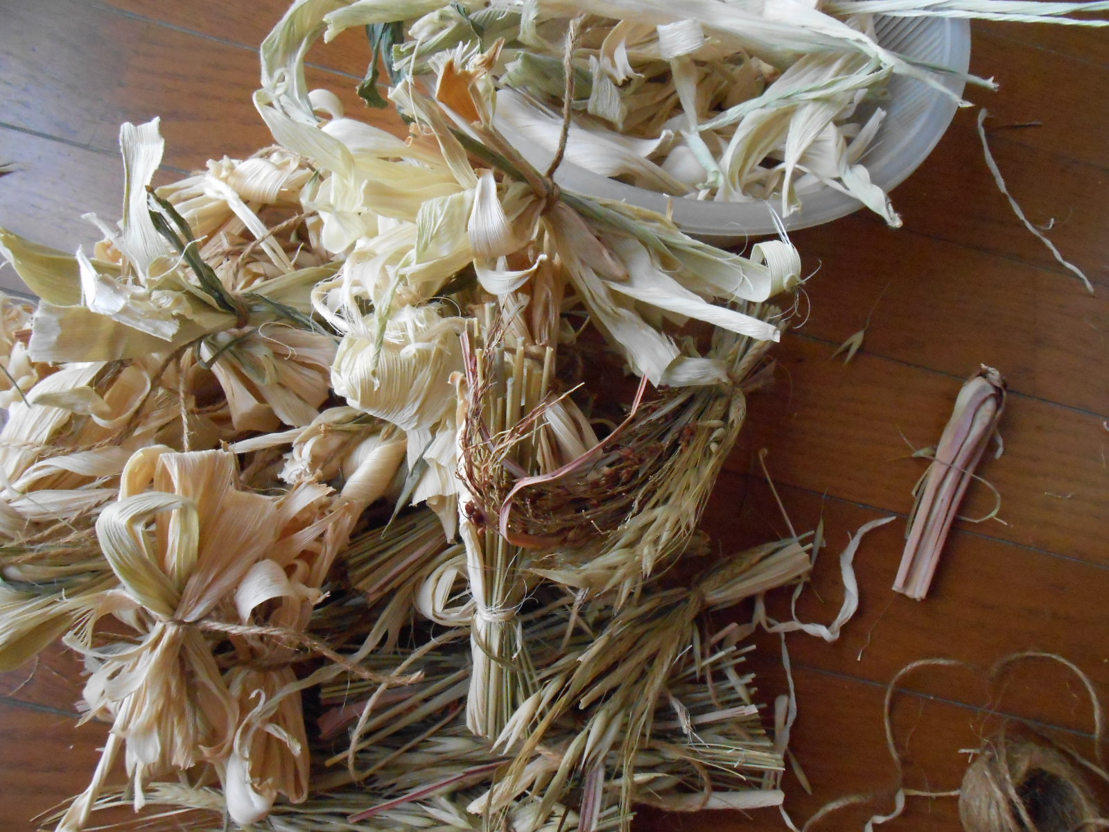 モロコシ皮以外にもレモングラスの葉っぱやら乾かしまして、そいつを適度な大きさに来るくるっと束ねたものをおもちゃ用にいくつも作っておくんですけどね、さすがに途中で束ね飽きてくる