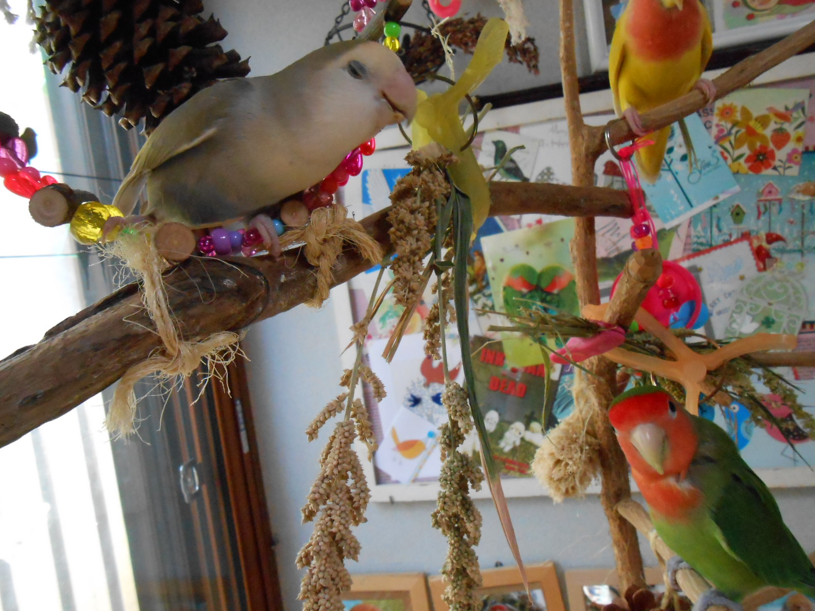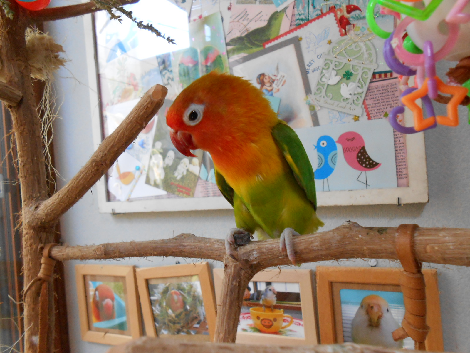 こうやって好きに飛んで好きなところで遊んで餌探して・・・は野生風味の醍醐味なんですが、ボタンインコのみかんさんは飛べない子なのでいつも下のパーチに止まってるだけになってしまいまして~~。